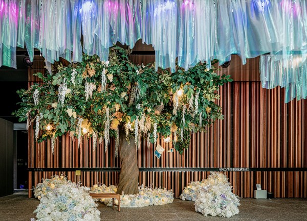 シンボルツリーを中心に、輝く雪や天空に揺らめくオーロラを表現しました。