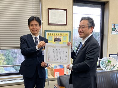 当社代表取締役社長の栢森雅勝が名古屋市役所を訪問し、名古屋市教育委員会 坪田知広教育長より感謝状をいただきました。